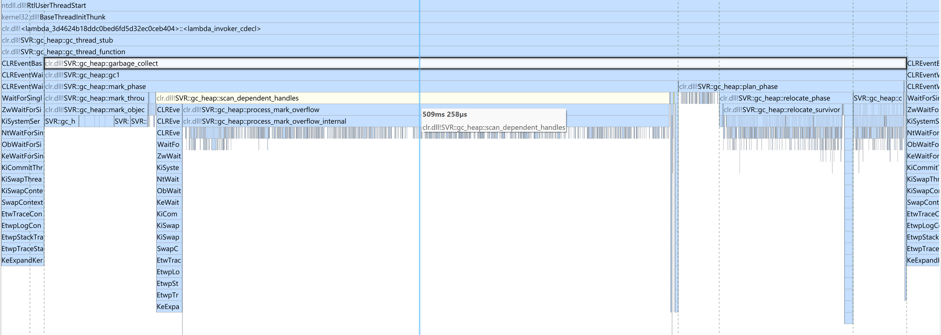 This part is actually a significant bottleneck in the .NET GC, so use dependent handles sparingly. To take a concrete example, I’ve observed in Visual Studio a 800 ms freeze during startup that was due to garbage collection. Upon further inspection, I discovered that during this collection the GC spends 60% of its time just scanning dependent handles!